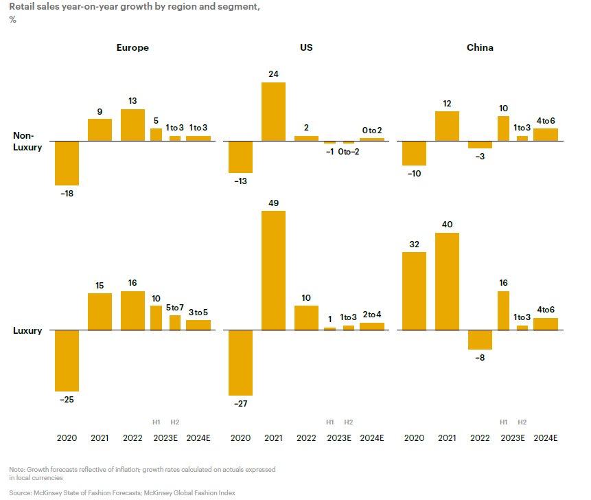 The "State of Fashion 2024" report by BOF and McKinsey forecasts a retail sales growth of 2% to 4% for the fashion industry in the upcoming year. The luxury market is expected to see a slowdown to 3-5% in 2024, down from 2023's 5-7%.