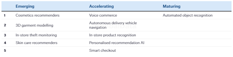 Within the emerging innovation stage, cosmetics recommenders, 3D garment modeling, and in-store theft monitoring are disruptive technologies that are in the early stages of application and should be tracked closely.